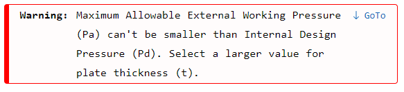 If there's any error in the calculation a red warning message (see Fig. 4.1) will be shown in the results page. The warning will have information regarding the error to help User fix it and, if the GoTo link is clicked, the equation with error will be shown.